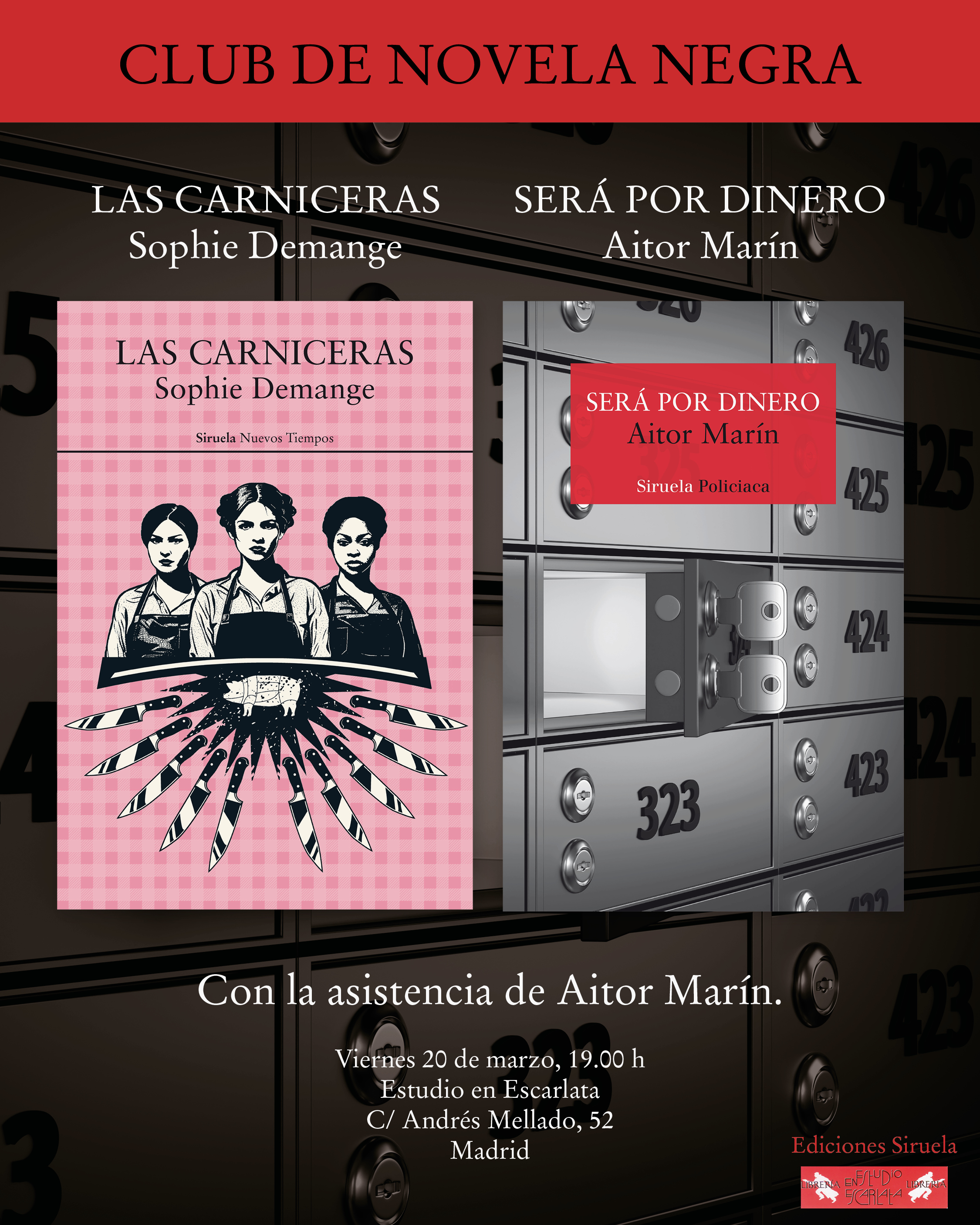 Viernes 20 de marzo, 19:00 horas, Club de novela negra, los libros elegidos son “Las carniceras” de Sophie Demange y “Será por dinero” de Aitor Marín.